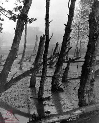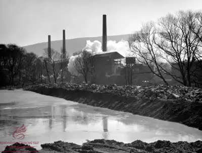 Coed sydd wedi'u gwenwyno oherwydd y llygredd a'r gwaith Phurnacite yn y cefndir