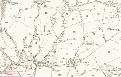 Mae'r map hwn o'r ardal o 1878 yn dangos mai prin oedd tai ym mhentref y Beddau yn y cyfnod hwnnw