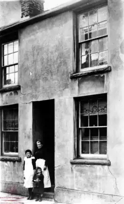Yn y llun hwn mae mam a dau blentyn yn sefyll wrth ddrws un o dai'r glowyr yn Fforchaman Row. Mae'r craciau yng ngwaith rendro'r waliau yn dangos pa mor gyflym yr adeiladwyd y tai hyn – nid oedd yr adeilad wedi cael amser i setlo cyn i'r gwaith rendro gael ei wneud.