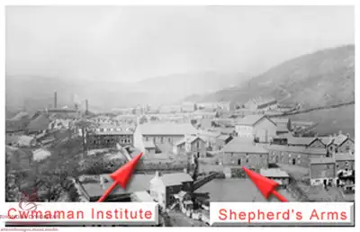 Sefydliad Cwmaman tua 1895 cyn y tân a ddinistriodd y prif adeilad yn gyfan gwbl. Mae Glofa Fforchaman ym mhellter canol (chwith) y llun a gellir gweld Glofa Cwmaman rhwng y ddwy simne yn y pellter. Mae'r tai newydd mewn cyflwr rhagorol yn yr 1890au, ond dirywiodd amodau byw wedyn wrth i'r pyllau dyfu.